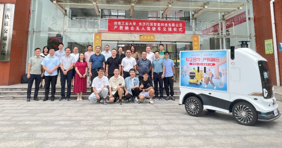 会前,双方举行了无人驾驶车的交接仪式,长沙行深智能科技有限公司向学院免费提供无人驾驶车,作为校企联合开发平台,助力学院科研团队开展自动驾驶、智慧物流、人工智能的软硬件研发。